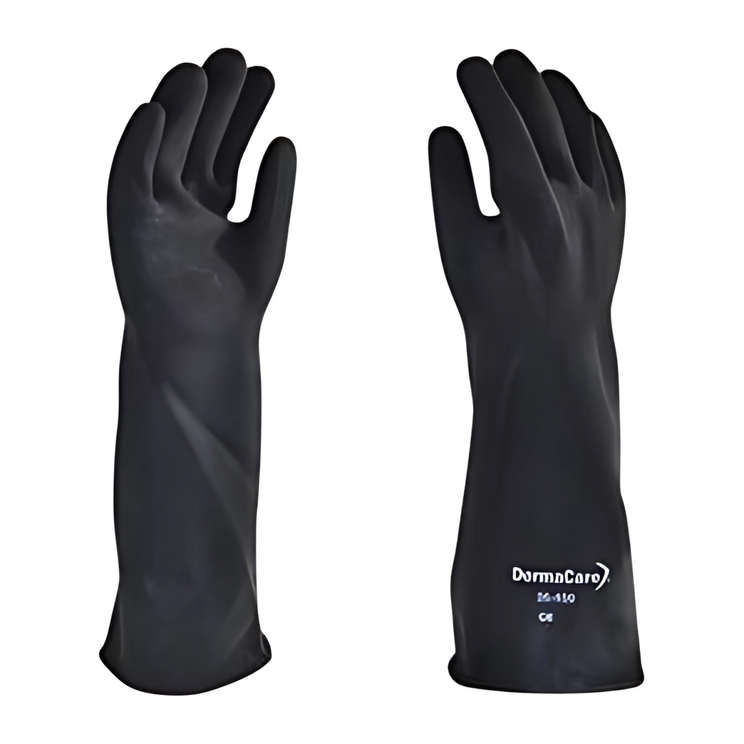 El Guante Negro de Látex con Puño Rolado 56-450, DermaCare, ofrece protección excepcional contra ácidos cáusticos y químicos corrosivos, con puño extendido para mayor cobertura.