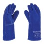 Guante de carnaza de res azul, hilo Kevlar, forro de hule espuma y algodón, puño recto, 14” pulgadas de largo. Guante para soldador en carnaza de res curtida al cromo, con doble engrase con tratamiento a base de aceites. Diseño tipo americano, con forro de hule espuma y algodón en todo el guante para alargar su periodo de vida. Cosido con hilo Kevlar, lo que permite que no se quemen las costuras al manejar altas temperaturas, refuerzo del mismo color del guante en palma y dedo pulgar.