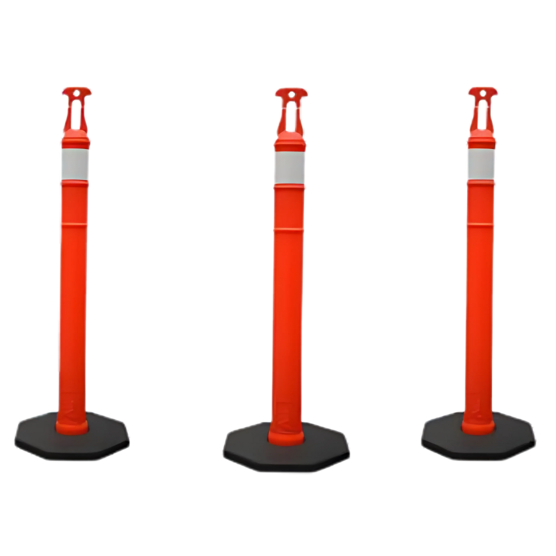 Dispositivo para control vial – poste fabricado en polietileno (pe) anaranjado . – base negra hexagonal fabricada en caucho reciclado.